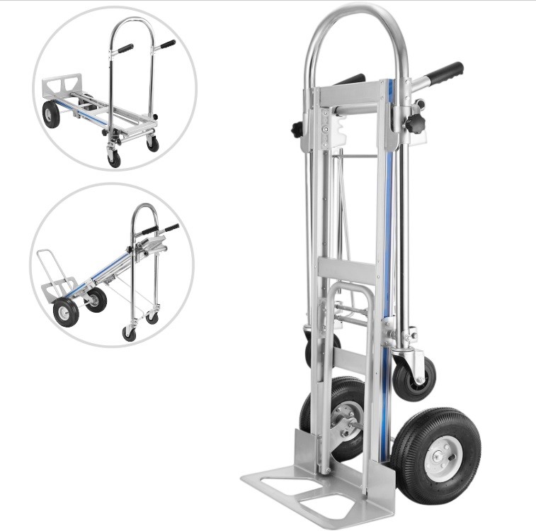 Il s'agit d'un chariot en aluminium. Bras de chariot en matériau de tube d’acier, autre matériau en alliage d’aluminium. Ce chariot en aluminium peut être facilement plié de la position du chariot à la position du véhicule utilitaire. Laissez ce chariot léger faire tout votre travail lourd. La conception ergonomique le rend idéal pour la maison ou le travail. Avec une seule main, il peut être facilement converti en chariot vertical à 2 roues et à 4 roues ou diable assisté à 4 roues avec une seule main, sans outils, sans goupilles.
