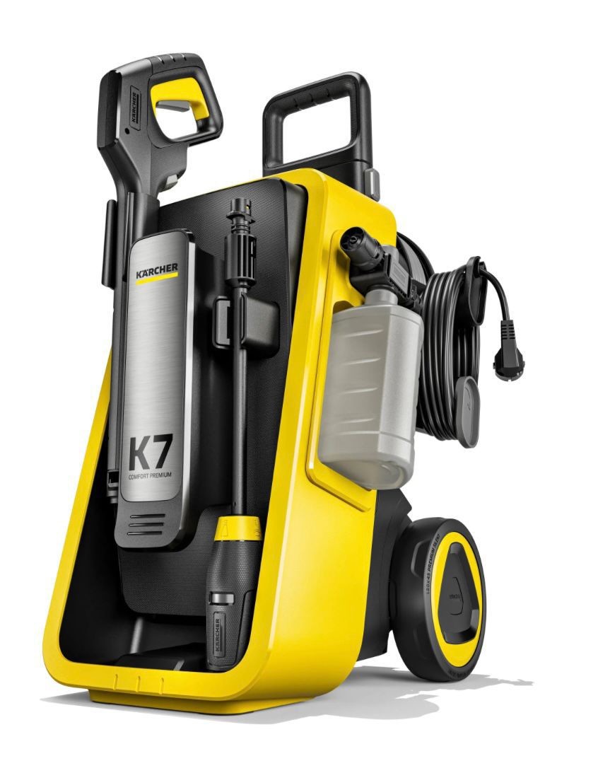 Le nettoyeur haute pression K 7 Comfort Premium . Le moteur refroidi par eau, d'une grande longévité, est conçu pour les nettoyages fréquents et garantit des performances fiables. L'enrouleur de tuyau intégré avec flexible PremiumFlex offre confort et flexibilité. De plus, le pistolet G 180 Q COMFORT!Hold réduit sensiblement la pression de maintien et le flexible haute pression se connecte rapidement grâce au système Quick Connect. La lance multijets 4 en 1 innovante combine 4 jets différents, réglables par rotation de la tête de la lance. Le concept de détergent 2 en 1 assure confort et application parfaite du détergent selon l'application. Les câbles et accessoires se rangent facilement sur l'appareil, tandis que la poignée télescopique et les roulettes à revêtement souple facilitent le transport. L'application Kärcher Home & Garden avec conseiller d'application intégré et conseils et astuces utiles fournit une assistance.