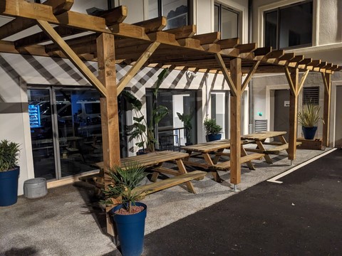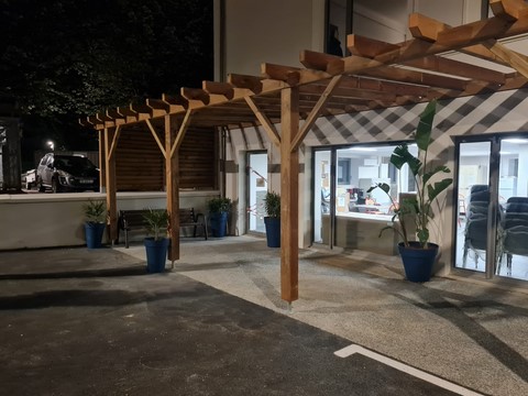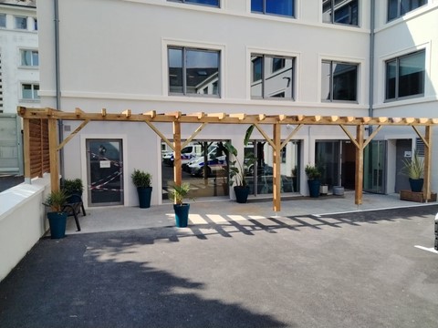 La pergola et des plantes ont été installées devant l'ESR et les aménagements intérieurs sont en cours.